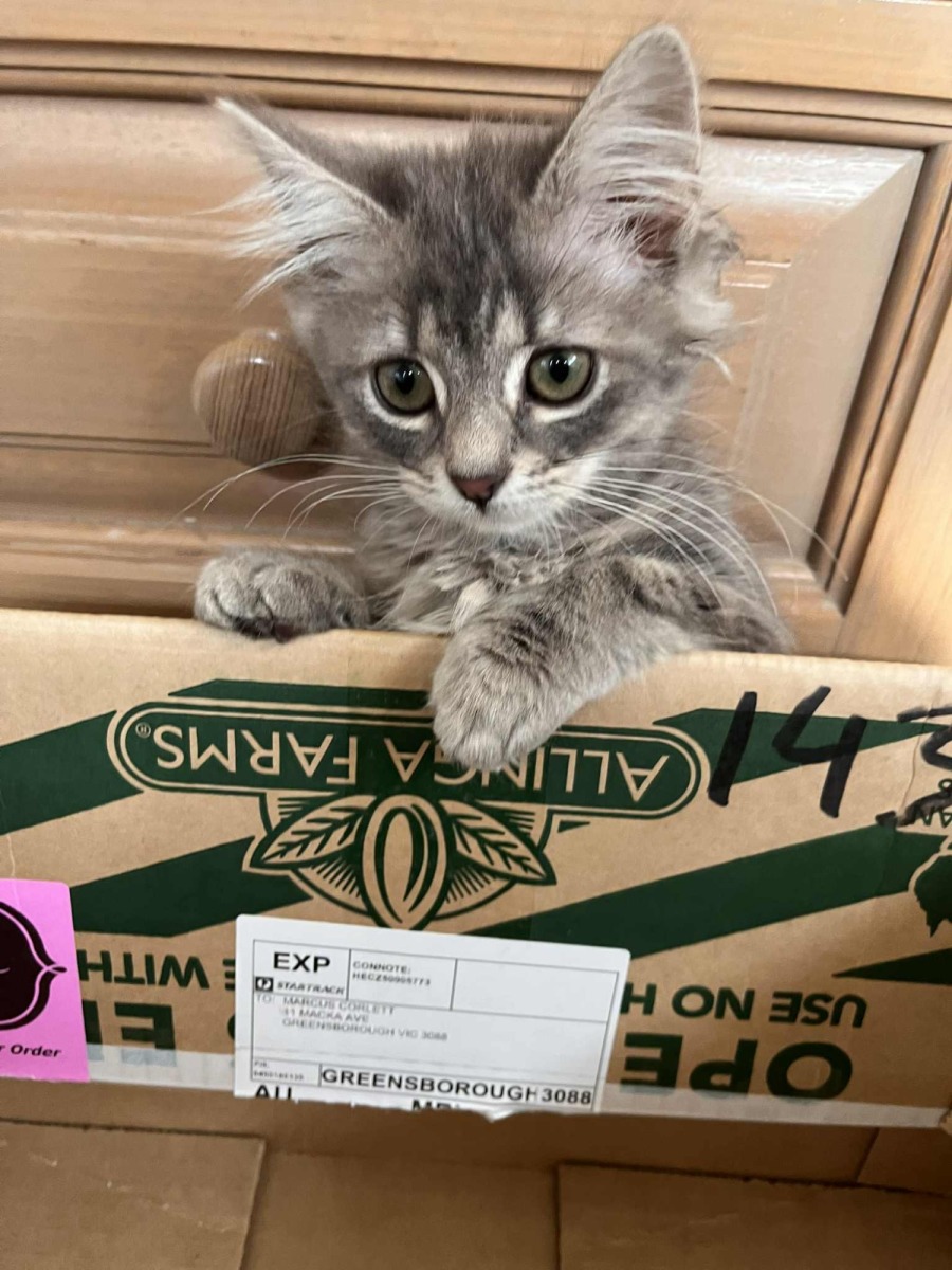 Trowel may be tiny, but her personality is larger than life! This floofy little rascal zooms around with her siblings, chasing, pouncing, and bouncing until she’s ready for a snuggly nap. Playful, silly, and endlessly entertaining, Trowel is a kitten who will make every day brighter.