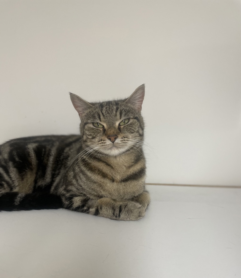 Rayne is a 1-year-and-6-month-old tabby cat with a charming blend of stripes and swirls in warm shades of brown, gold, and soft grey. Her coat catches the light beautifully, and her expressive eyes always seem to be looking for connection-full of affection and curiosity.