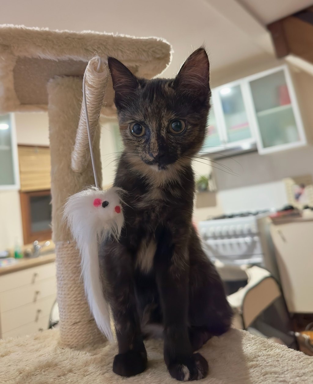 Caramel is one half of a bonded pair of 12-week-old sisters who are looking for a forever home together. The smaller of the two, Caramel is a gentle tortoiseshell kitten with a heart as sweet as her name. She can be a little reserved at first, but once she feels comfortable, she'll happily curl up in your lap, purring away while soaking up all the love. Playful and curious, she especially enjoys a game of catch and will keep you entertained with her antics. Caramel and her sister Toffee are inseparable, spending their days playing, napping, and snuggling close-so they'll need to be adopted as a pair to keep their special bond intact.