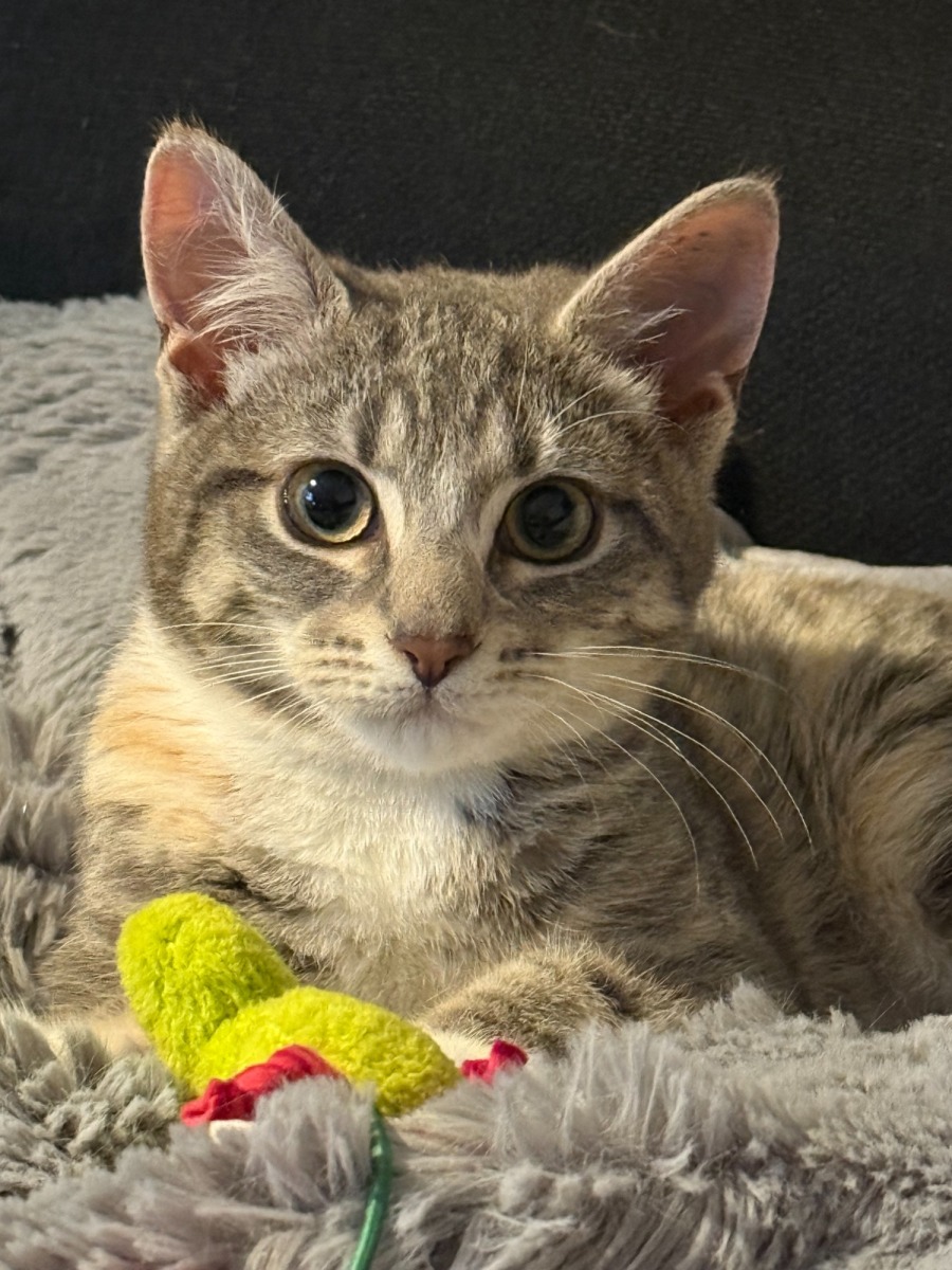 In just a few short weeks, this brave little girl blossomed into one of the cuddliest, purring lovebugs. She’s still a little shy at first, but once she trusts you, Camie becomes a total snuggle machine. She adores both human and feline company and is often found curled up next to her people or playing gently with adult cats.