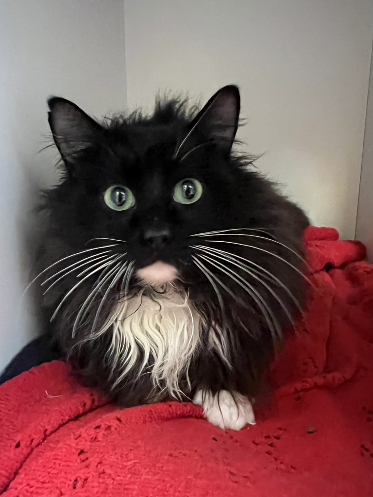 Rocco is a 4-year-old fluffy tuxedo gentleman with a heart as soft as his fur. This handsome boy is social and loves the company of other cats. Whether he's lounging in a sunny spot or curling up next to a feline friend.