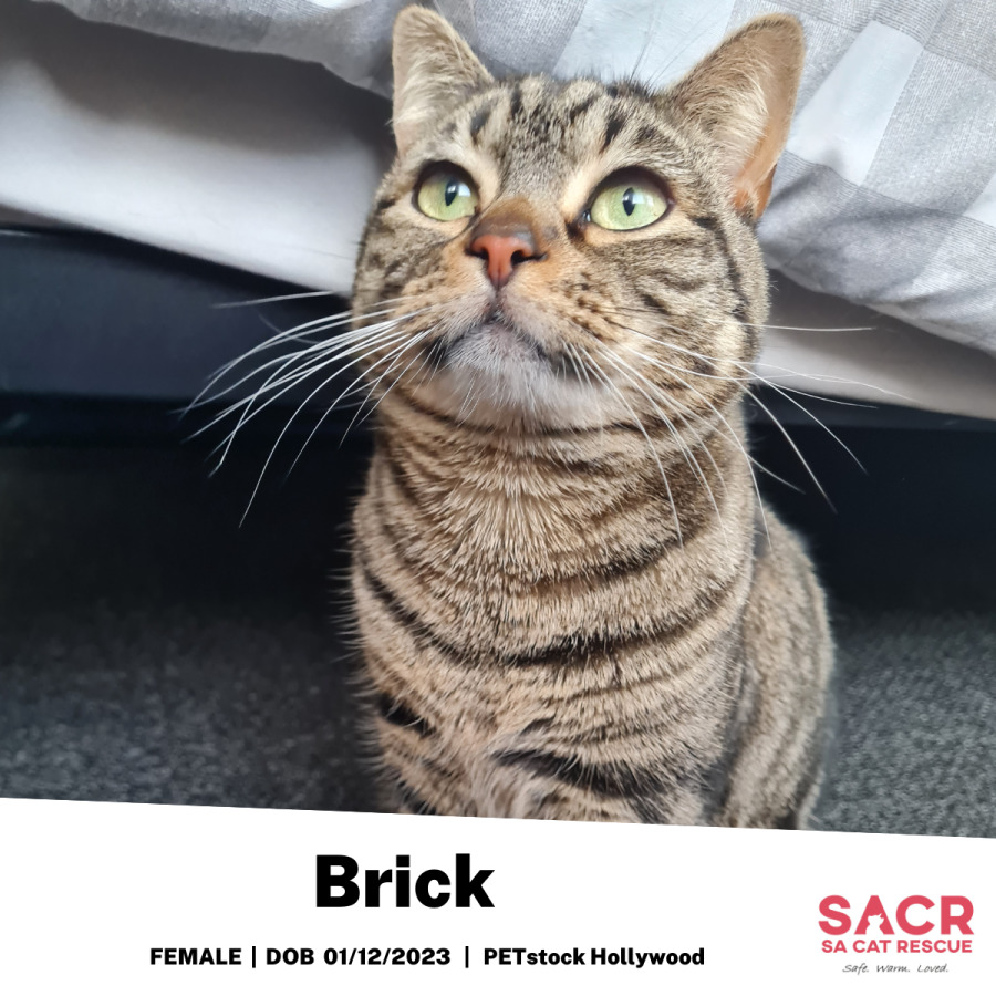 Brick is a gentle little soul who starts out shy, but once she feels safe, her sweetness shines through. She adores toys on strings, loves her food, and has the softest coat just made for pats. A true purring machine, sheโll let you know how happy she is with every cuddle.