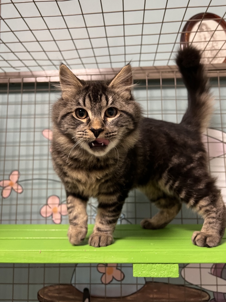 This playful and friendly kitten is always ready for a game, whether it's chasing toys, pouncing on feathers, or exploring every nook of her environment.