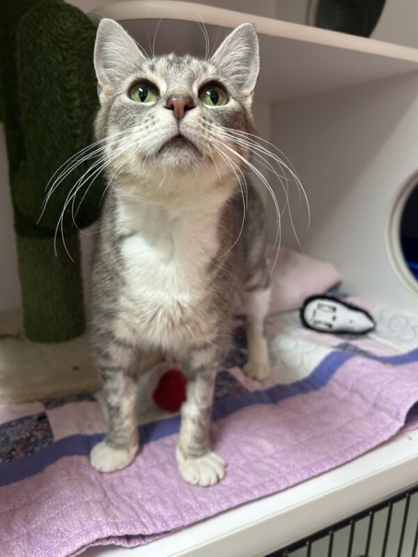 Hello there! I'm Chicken Nugget, a playful 3-year-old Domestic Short Hair lady with an average energy level. Don't let my name fool you - I'm not for eating, but I am ready for lots of love and cuddles. I have a soft, short coat that you won't be able to resist stroking. I'm a social butterfly and I get along just fine with children. I haven't met a kiddo yet that I didn't like! I’m not overly energetic, but I still love to play and explore my surroundings. I enjoy a good catnap as much as the next feline, but I'm also always ready for some fun when you are. I'm really looking forward to finding my forever home. If you think you could be my new best friend, I can't wait to meet you! Let's make some amazing memories together. I promise to bring joy and warmth into your life. Can't wait to meet you, future family!