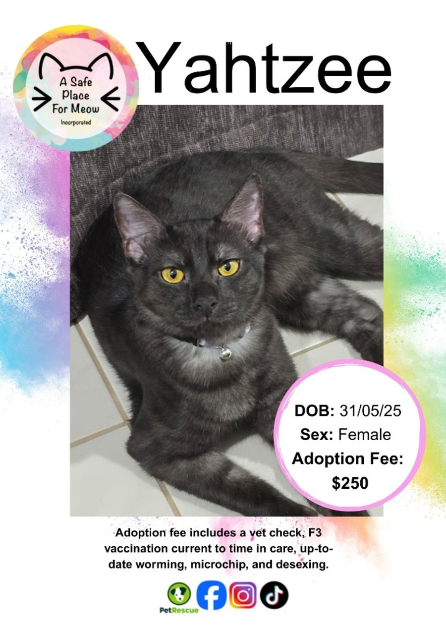 Our adoption fee helps us give every cat the best start in their new life. It covers their initial health check, microchip, desexing, up-to-date F3 vaccinations, and up-to-date worming.