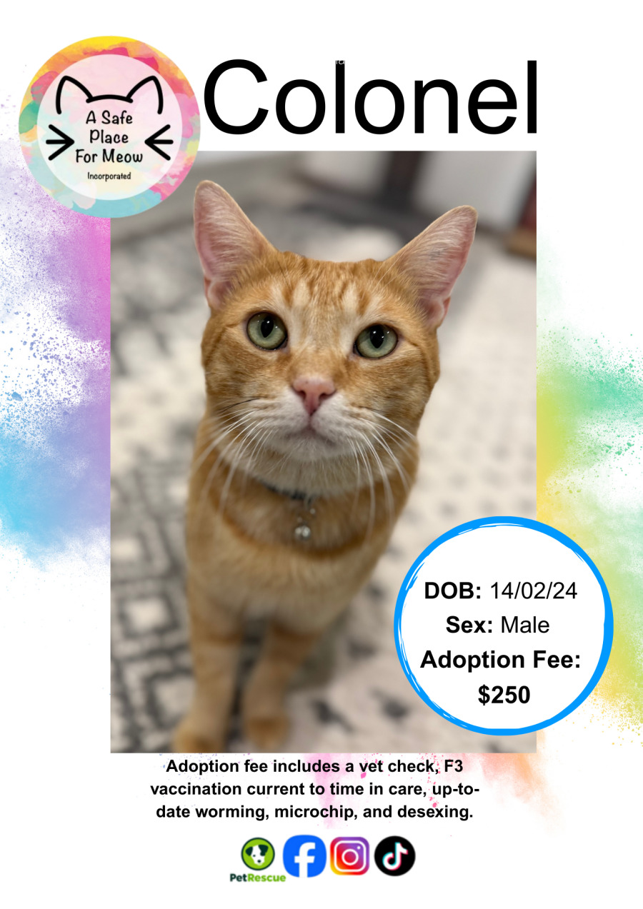 Colonel, a charming and sweet cat who has a wonderful mix of gentleness and sensitivity! Though he can be a bit anxious and easily startled, Colonel has so much affection to give. He absolutely adores being patted and expresses his delight with an adorable display of kneading the floor, lifting and curling his paws like a high-stepping horse.