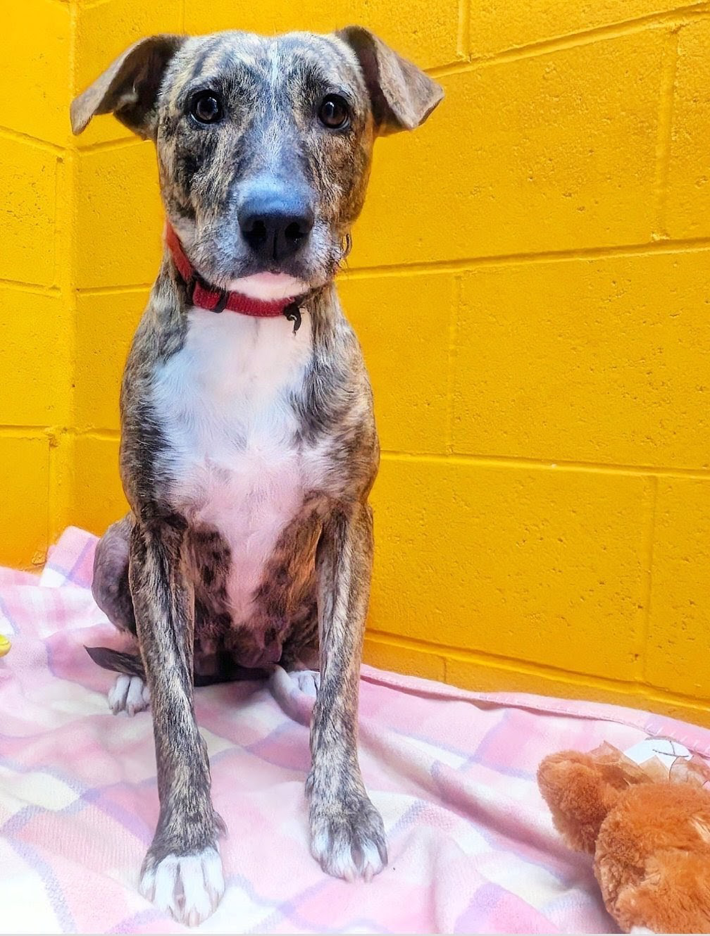 Hi there... I'm Zella. I'm a 3-year-old Staffy mix with soft eyes, a sweet heart, and a shy little soul. The world can feel a bit overwhelming for me sometimes, so I'm searching for a special person-someone kind, calm, and very patient-who will give me the space and time I need to truly feel safe.