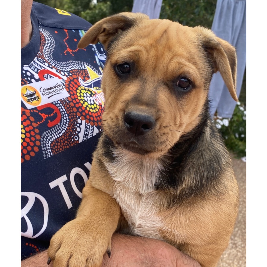 Introducing Basil, a super sweet male puppy from The Spice Litter, five gorgeous pups born on 17 June 2025. They are mix of JRT, Staffy and Cattle Dog.