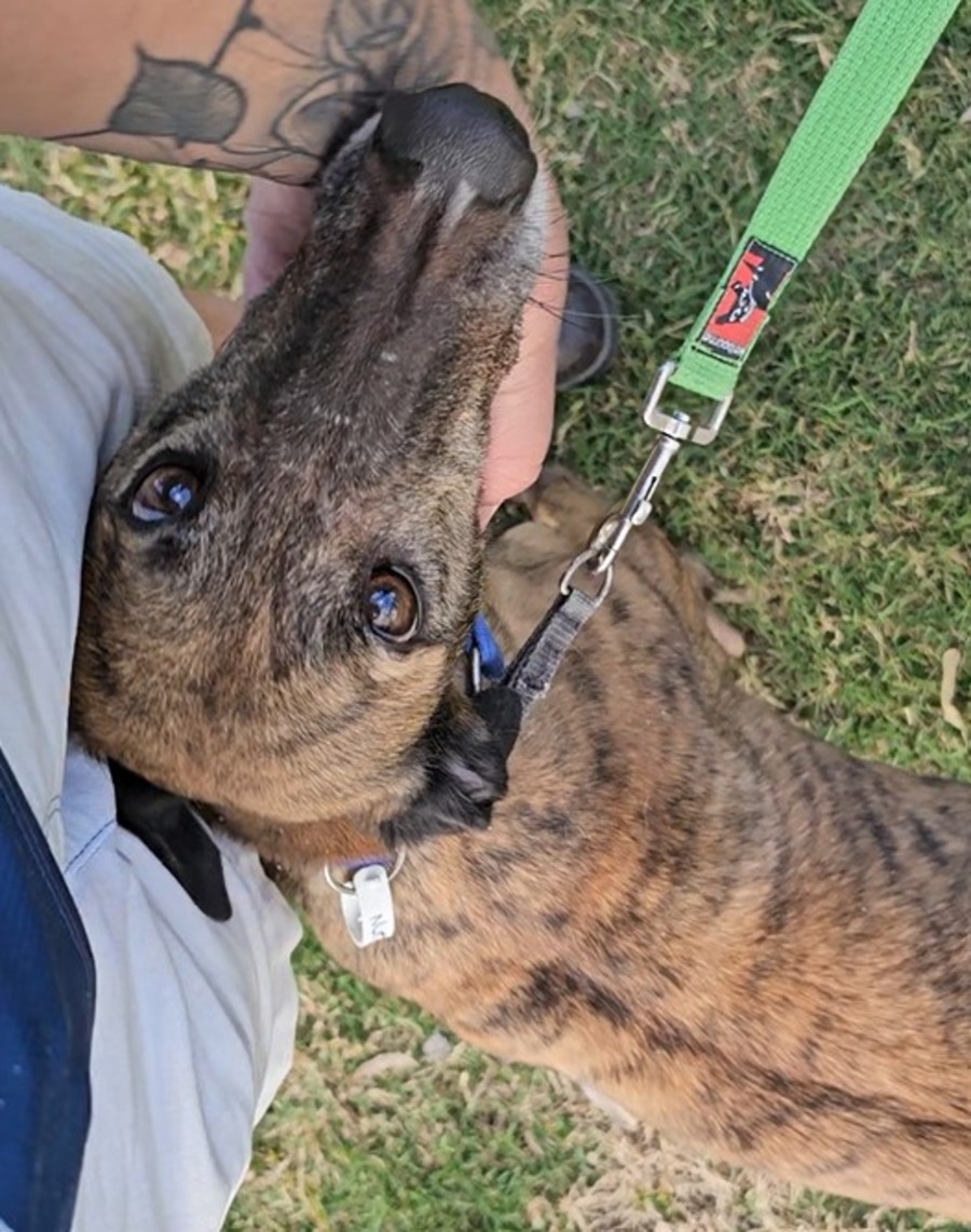 She is a beautiful dark brindle girl with a big personality and an even bigger heart. She’s incredibly people-oriented, eager to please, and thrives on companionship — both human and canine. She’d love a home with another dog (any size!) to keep her company and help her feel secure. She’s all about the good times—whether that’s joining in on whatever her humans are doing, exploring new places, or (her personal favourite) anything that involves food!
