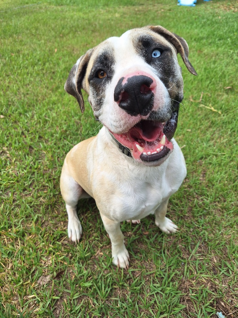 Blue is a 3-year-old Catahoula-Mastiff mix whose stunning blue eye is just the beginning of his charm. Beneath his impressive appearance lies a calm, loving companion who adores his people and thrives on connection.