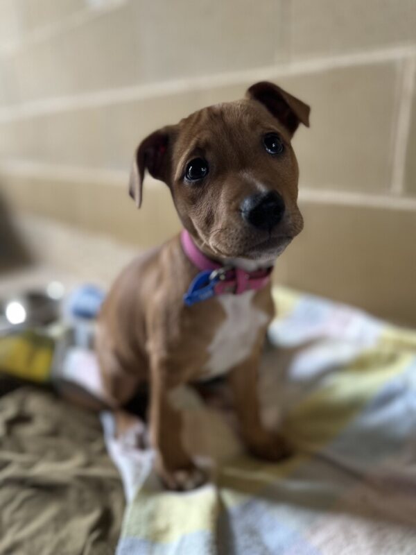 Hi there, you can call me Nelly! I'm a 2-month-old female Staffordshire Bull Terrier puppy. I'm an eager learner, looking for a home where I can explore the world and learn new things every day. I'm young, so my energy level is quite moderate and would fit well into a household with a similar energy level. I'm very social and love meeting new doggie friends! I haven't had the chance to meet other types of pets yet, but I have no known history of issues with them. I'm also great around kids, although I haven't had a specific age range to interact with just yet. I'm hoping to find a family that works average hours so we can spend plenty of time together. I promise to bring lots of love, laughter, and puppy kisses into your life. I can't wait to meet you and start our journey together!