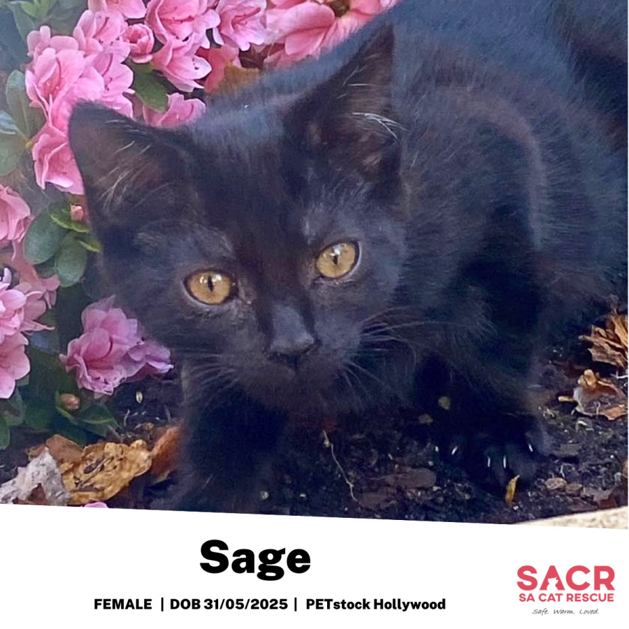 Sage's adoption fee is $195 which includes desexing, microchipping, parasite prevention, and initial F3 vaccination.