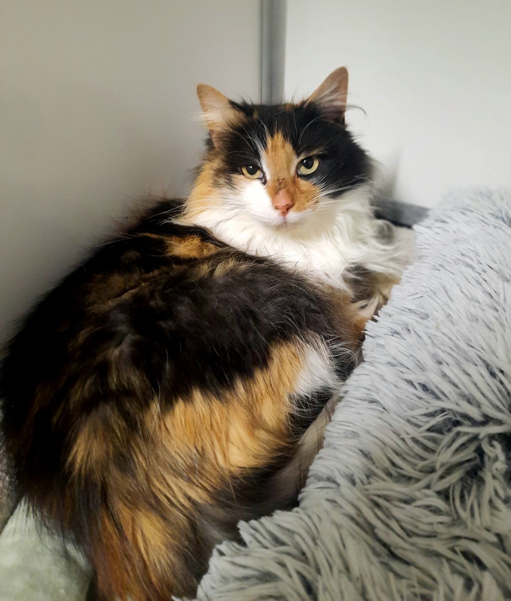 Carousel is a stunning 3-year-old calico beauty with the fluffiest coat and the sweetest soul. She has a gentle, quiet nature, but don't mistake that for shyness-she absolutely adores people and can happily spend her day curled up beside you, soaking in all the affection she can get. Snuggles are her love language, and she'll quickly win your heart with her calm and loving presence.