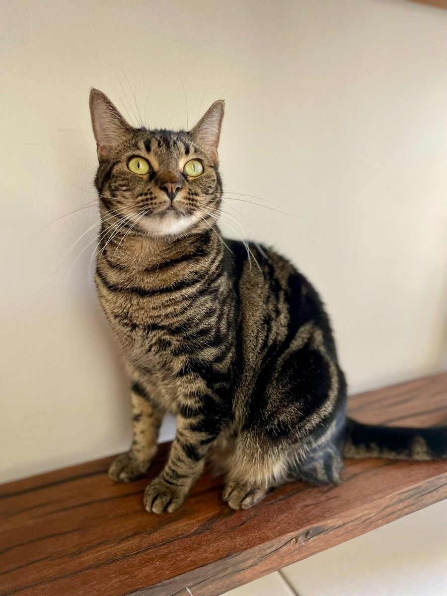 Her days are filled with noble quests, sun drenched cat naps by the window and important cardboard box inspections. She's a wand toy warrior and a vocal little greeter when you come home, basically your own furry fan club. Carla would thrive best in a home where she can be both your shadow and your sunbathing sidekick. She's well mannered, litter trained and has a gently nature that makes her a joy to be around. While she can be a little shy with new people at first, patience and a few tasty treats are the key to winning her over. Once you're in her circle of trust, you'll have a loving, chatty companion who's always nearby.
