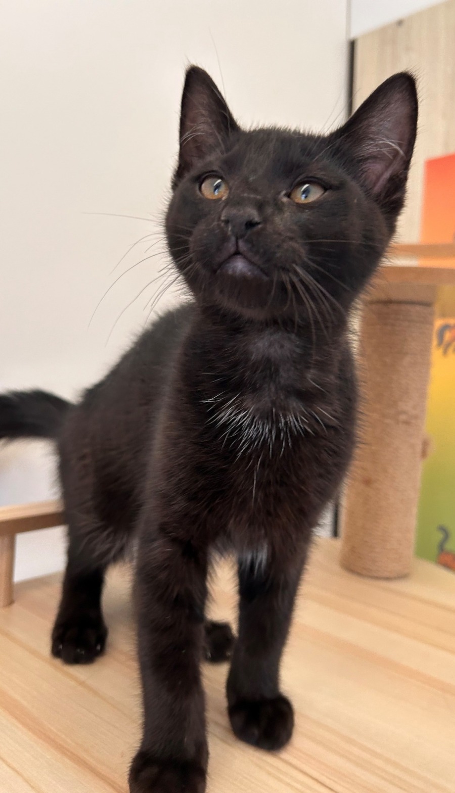 Looking for a playful, purring ball of energy with impeccable style? Say hello to Taco – a charming little black domestic shorthair kitten who's as sweet as he is spunky!