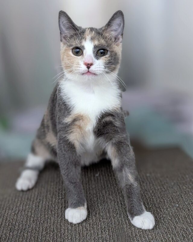 Hi, my name is Cricket. I am a curious 3-month-old kitty, full of energy, curiosity, and love for life. As much as I love playing and being mischievous, I am also very content napping in sunny spots and curling up for a cuddle. I do have a condition called Cerebellar Hypoplasia which affects my co-ordination. I am therefore a wobbly cat. i think i am best suited to a family with children over 6. My condition will not get better or worse. Therefore, I cannot jump like other cats and will likely stay on the floor. If I somehow do get up somewhere, I will need help getting down as I do not have the ability to land on my feet safely like another cat. I will need a home that will allow safe exploration, so I do not hurt myself. I am social and love spending time with people so daily companionship and a warm lap or two to call mine would be perfect. I am currently mastering my litter box skills and doing my best not to knock things over. I hope to find a family who will give me steady routines, lots of gentle play, and regular veterinary care. My extra needs: I require a veterinary consult prior to adoption. If you’re seeking a playful, loving young girl who will brighten your days, I’m ready to meet you.