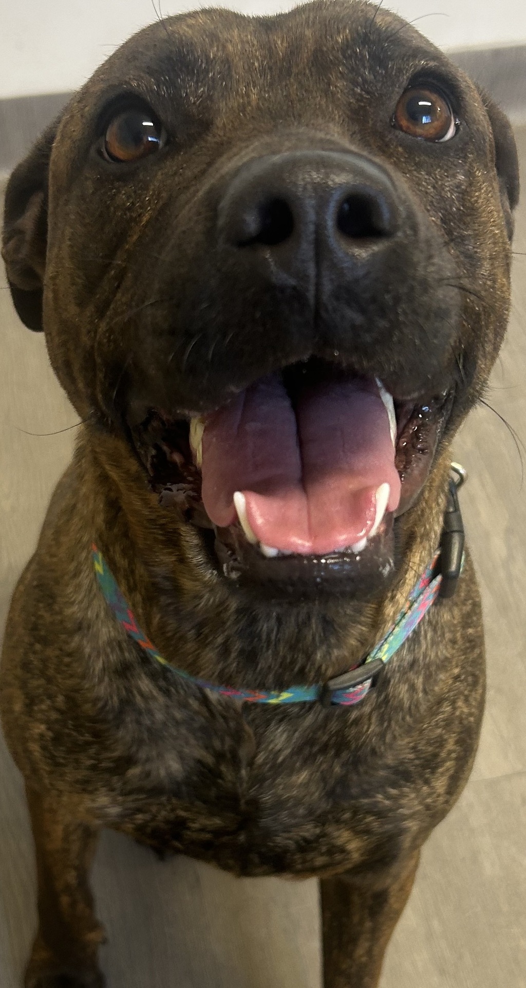This gorgeous brown brindle Staffy is as sweet as her name! 🍫 Mocha is an outgoing, easy-to-please girl who's ready to shower her new family with love and loyalty. 💕