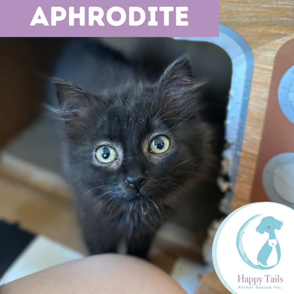 Aphrodite is a beautiful black medium-haired kitten with a heart as sweet as her name. This little goddess loves to play and explore, but what she enjoys most of all is cuddling up with her humans.