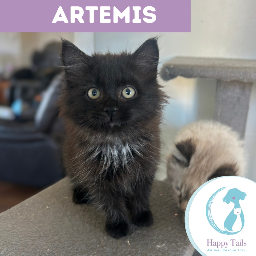 Artemis is a gorgeous black medium-haired kitten who is ready to find her forever family! This sweet girl loves nothing more than being right in the middle of family life. Whether it’s curling up on the couch for cuddles, quietly chatting to you with her soft little meow, or following you around to see what you’re up to, Artemis is happiest when she’s part of the action.
