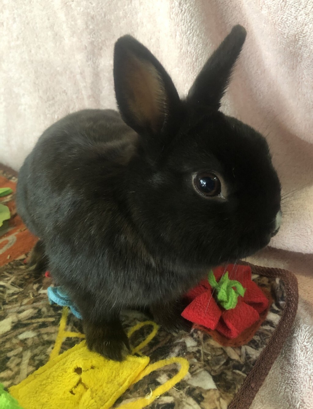 I am a young rabbit who is still learning about the world and as a result I might get into some mischief. I'd love lots of enrichment activities to keep me entertained and out of trouble! I love nibbling on hay filled puzzles, hopping through tunnels, and playing with chew toys or cardboard castles. A little variety will keep me feeling engaged and delighted! I love to show off that I am having a great time with lots of bunny binkies!
