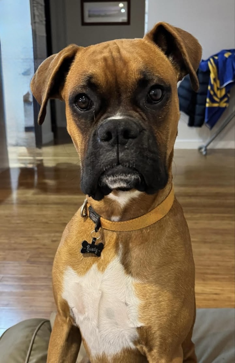 Rusty loves being close to his people and is heβs happiest sitting right on top of you. Heβs amazing with kids though his bouncy boxer energy makes him better suited to a home without toddlers.