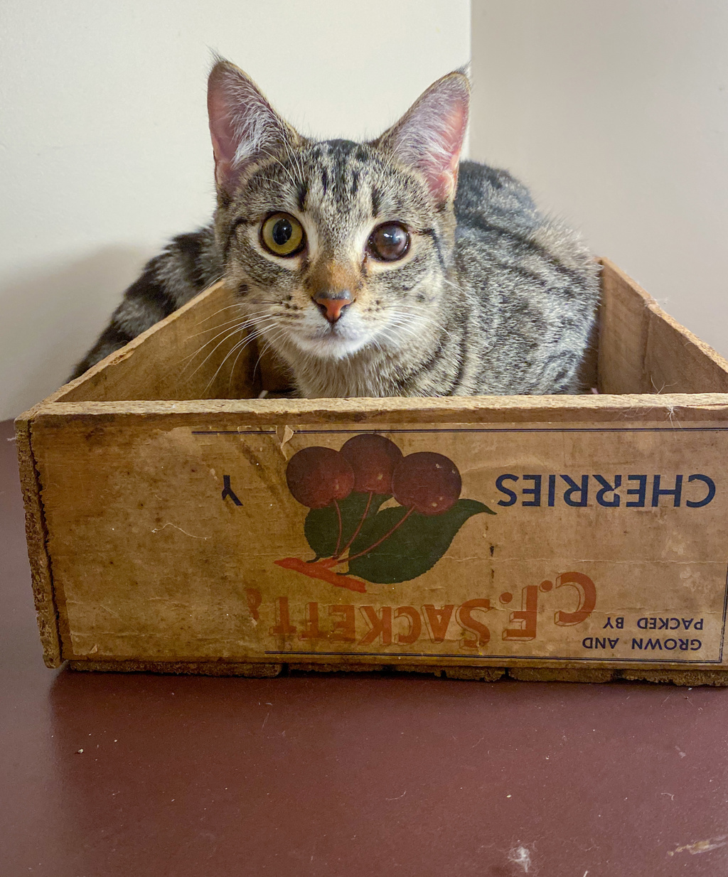 Prior to being found dumped in a carrier and coming into care Ivy sustained a scratch injury to her eye and was very lucky not to have lost it. She has reduced vision in that eye but the specialist tells us she will be fine and it doesn't require any treatment. She is just always going to have one darker eye.