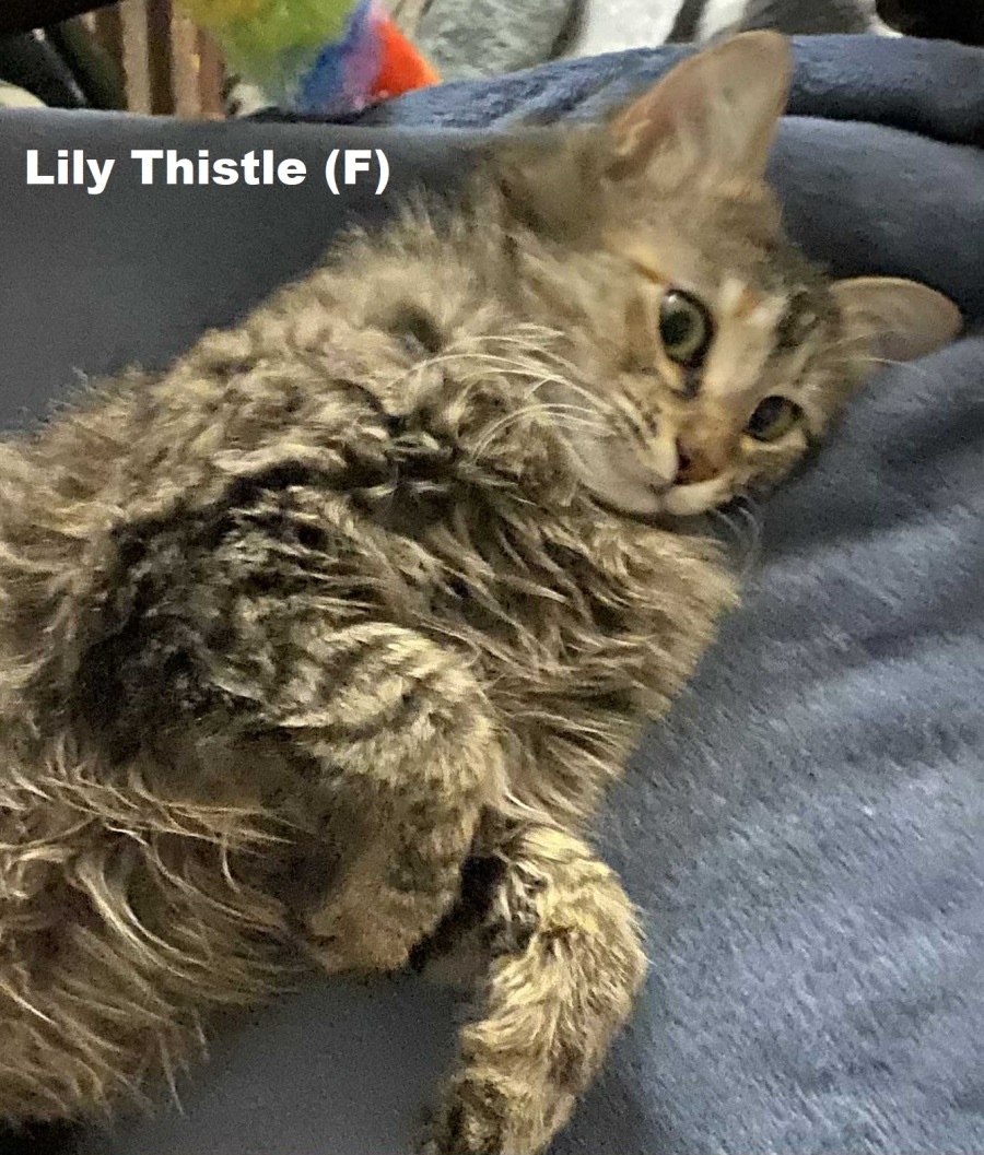 When Lily Thistle first came into care, she was covered in scratches and open wounds— but with love and treatment, she’s healed beautifully. She’s now a happy, healthy little cat with the softest medium tabby coat and striking green eyes that sparkle with curiosity.