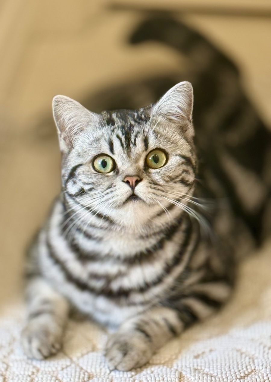 Meet Silverbell, a breathtaking silver tabby British Shorthair who effortlessly combines elegance and charm with a super sweet personality. She is the embodiment of grace, possessing not only a strikingly beautiful appearance but also a loving, affectionate nature that makes her truly irresistible. Silverbell is as polite and well-mannered as they come, with a peaceful and harmonious demeanor guaranteed to melt your heart.