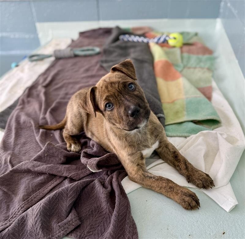 Hi, I'm Odd Ball. I'm a 2 month old male Staffordshire Bull Terrier puppy. I love exploring with a wagging tail and a curious nose. I’m ready to learn about life every day and I’m eager to meet new people, dogs, and places. I need a home with someone who works average hours, I thrive on a steady routine and lots of positive training. My energy is moderate: I’ll happily zoom around for a bit, then settle in for cuddles and quiet time. I have no known child-related issues, so I’m likely to be good with children when supervised. I appear dog social and I get along with other dogs well. No known history of issues with other pets. Training and behavior: I need daily opportunities to learn about life and how to be the best puppy I can be. I’m eager to learn manners, basic commands, and how to be a confident companion. If you’re patient, loving, and ready to invest in a growing pup, I’d love to meet you. Let’s start our adventure together.