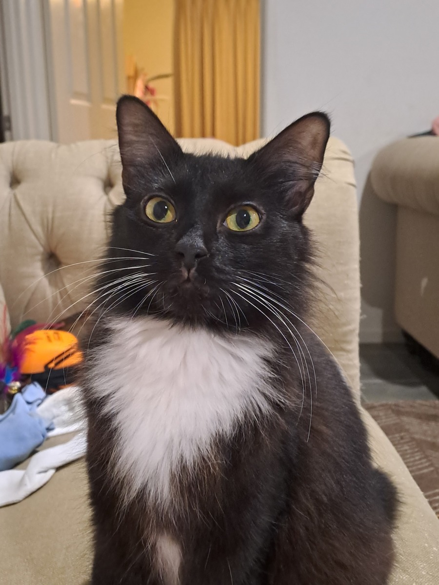 My name is Aubree. I'm an affectionate small tuxedo cat who loves human company and is always in the mood for a good pat. I like to spy on you from my secret place.