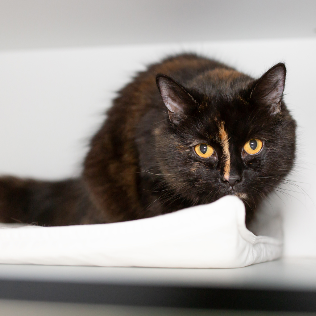 Meet Bambi, a stunning medium-haired tortoiseshell with gorgeous locks and plenty of "tortitude!" This queen knows exactly what she wants and isn't afraid to let you know. Bambi would love a calm, quiet home where she can claim a sunny window spot as her throne and receive regular grooming to keep her coat looking fabulous. Give her the space she deserves, and she'll reward you with years of love, companionship, and the unmatched charm only a tortie can bring.