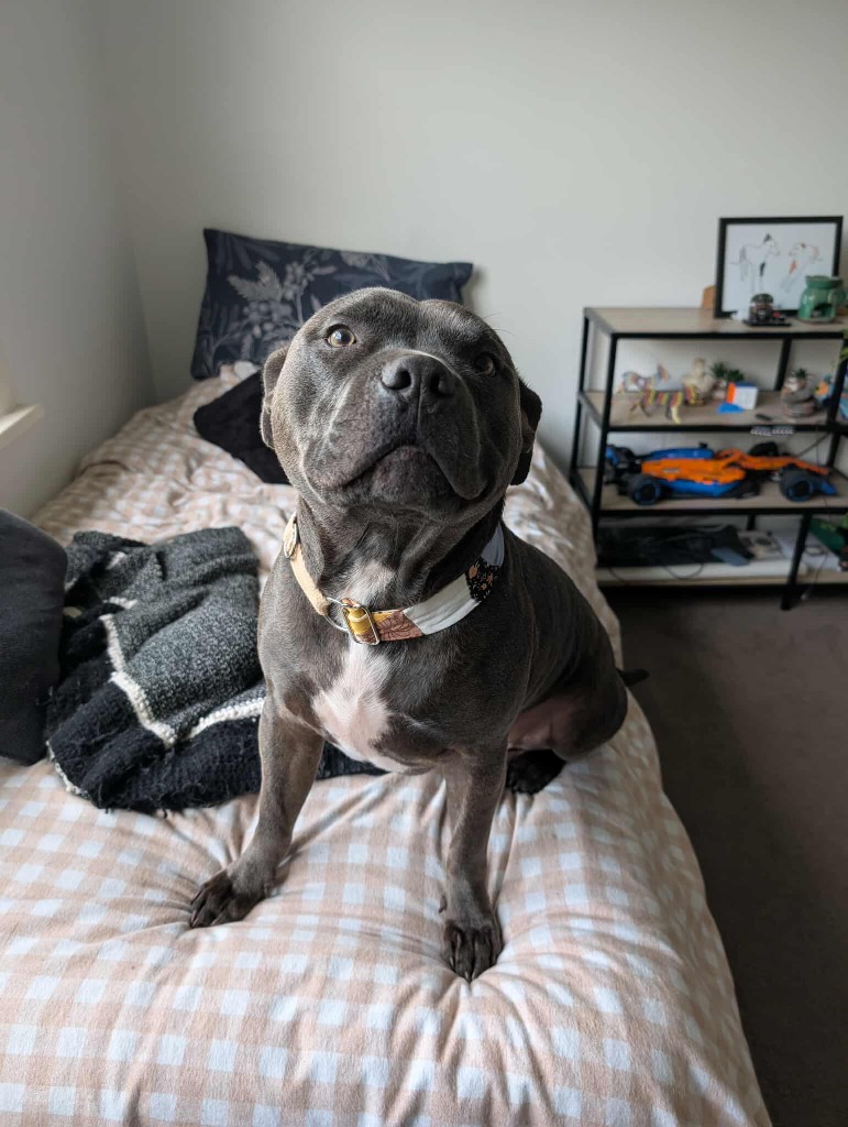 Buddy, who we've been affectionately calling "Hippo", is a snuggly and affectionate boy who loves nothing more than finding a sunny spot, or a on the couch to curl up with his people. At night he’s happy to settle into his crate after a little encouragement, though he’d happily keep you company in bed if allowed.
