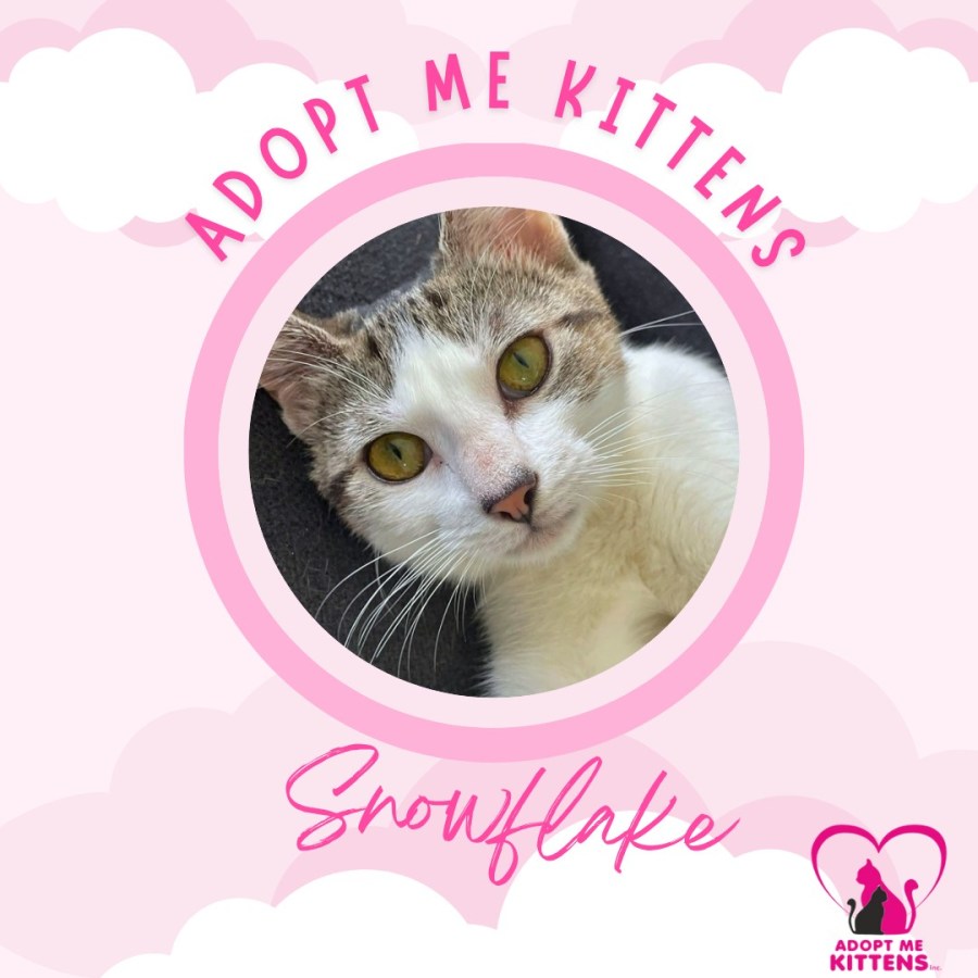 Meet Snowflake! This lovey little kitten is just the sweetest companion to give you cuddles and talk meows with you. She’s still a little bit scared of new places and loud noises, so expect her to hide for the first few days in a new home. But with patience and understanding - and a whole lot of love - Snowflake will be sure to grace you with her trust and snuggles.