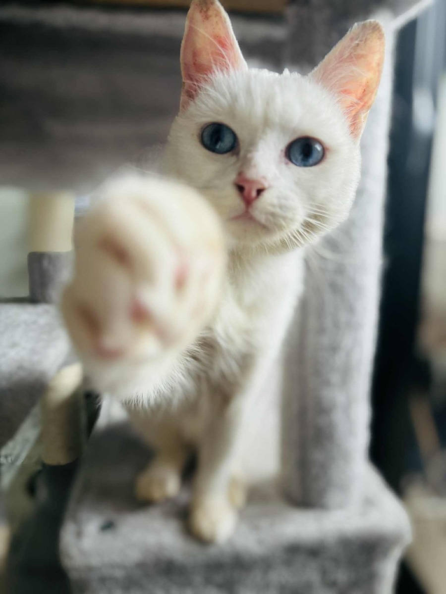 At just 5 months old, Bluey is a bundle of affection wrapped in soft white fur and the most mesmerizing blue eyes you've ever seen. He is a cuddle enthusiast who melts into laps and purrs like a tiny motor, especially when he's just woken up from one of his many nap sessions. Bluey's playful spirit shines through in everything he does, from chasing toys to bounding after his foster sibling. He's curious, confident, and learning to navigate the world with sweetness and spark. The best part, Bluey absolutely loves men and will quickly become one of "the boys" every chance he gets.