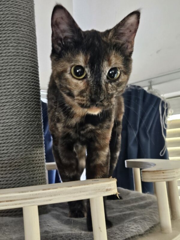 Hi, I’m Toffee, a female Domestic Short Hair. I’m 10 months old. My energy level is average, which means I’m happy with both cozy cuddle times and gentle play. I love sunlit spots, soft blankets, and exploring with a feather wand. I’m curious, friendly, and I’ll greet you with a soft purr and a gentle head bump. I’m good with kids and have no known child-related issues, so I’d be a sweet addition to a family that values patience and routine. I’m learning to trust new people quickly and I thrive in calm, loving environments. I’d do well in a home with gentle routines, a few safe toys, and lots of opportunities to cuddle on your lap. I’m ready to grow and discover new things with you by my side. If you’re seeking a loyal, affectionate companion who will bring warmth to your days, consider welcoming me into your home.