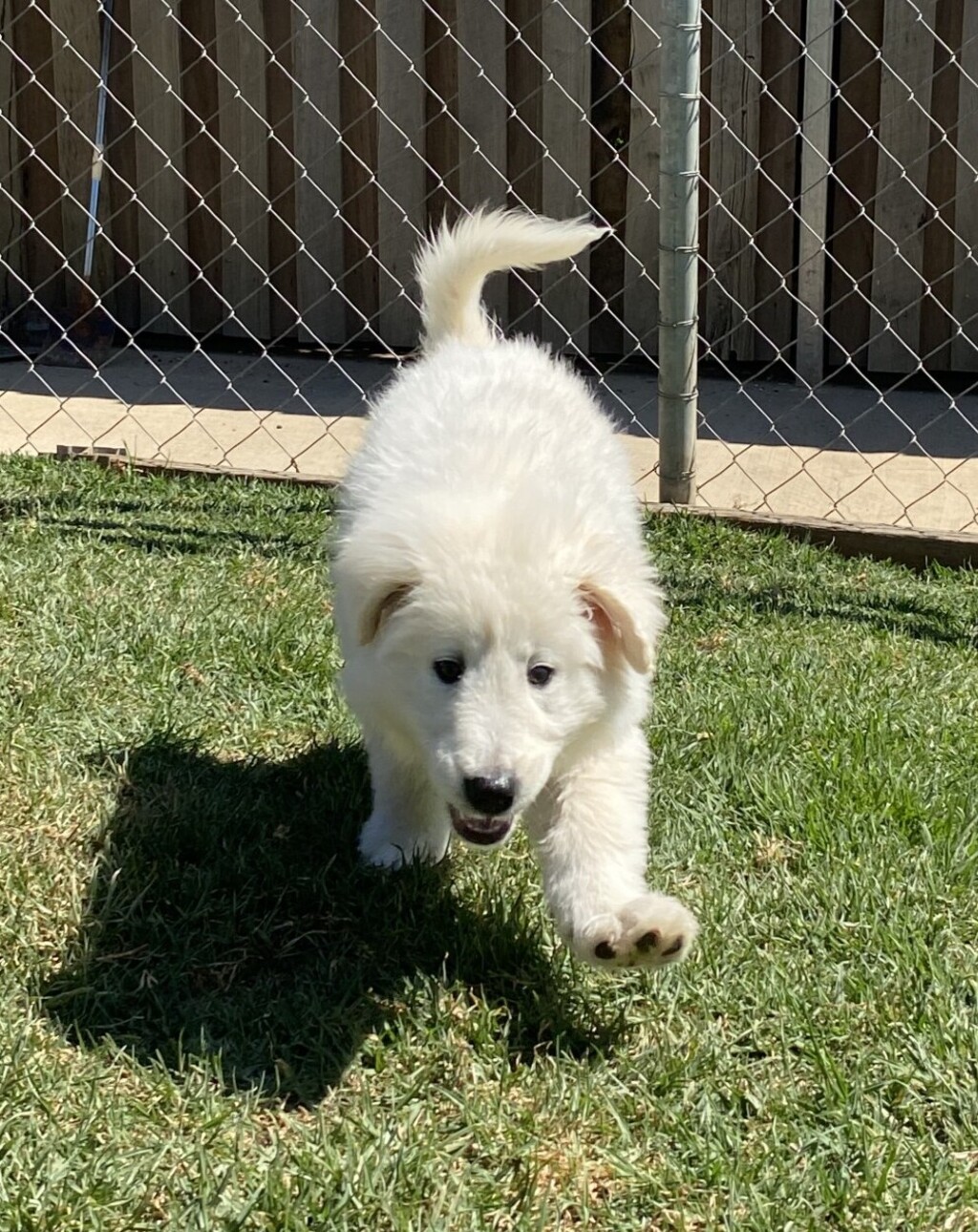 Aurora is a sweet female Maremma puppy with a calm, thoughtful nature and a coat as soft and white as freshly fallen snow. She's still small now, but she'll grow into a large, majestic dog with a thick, luxurious coat that will need regular grooming to keep her comfortable and mat-free.