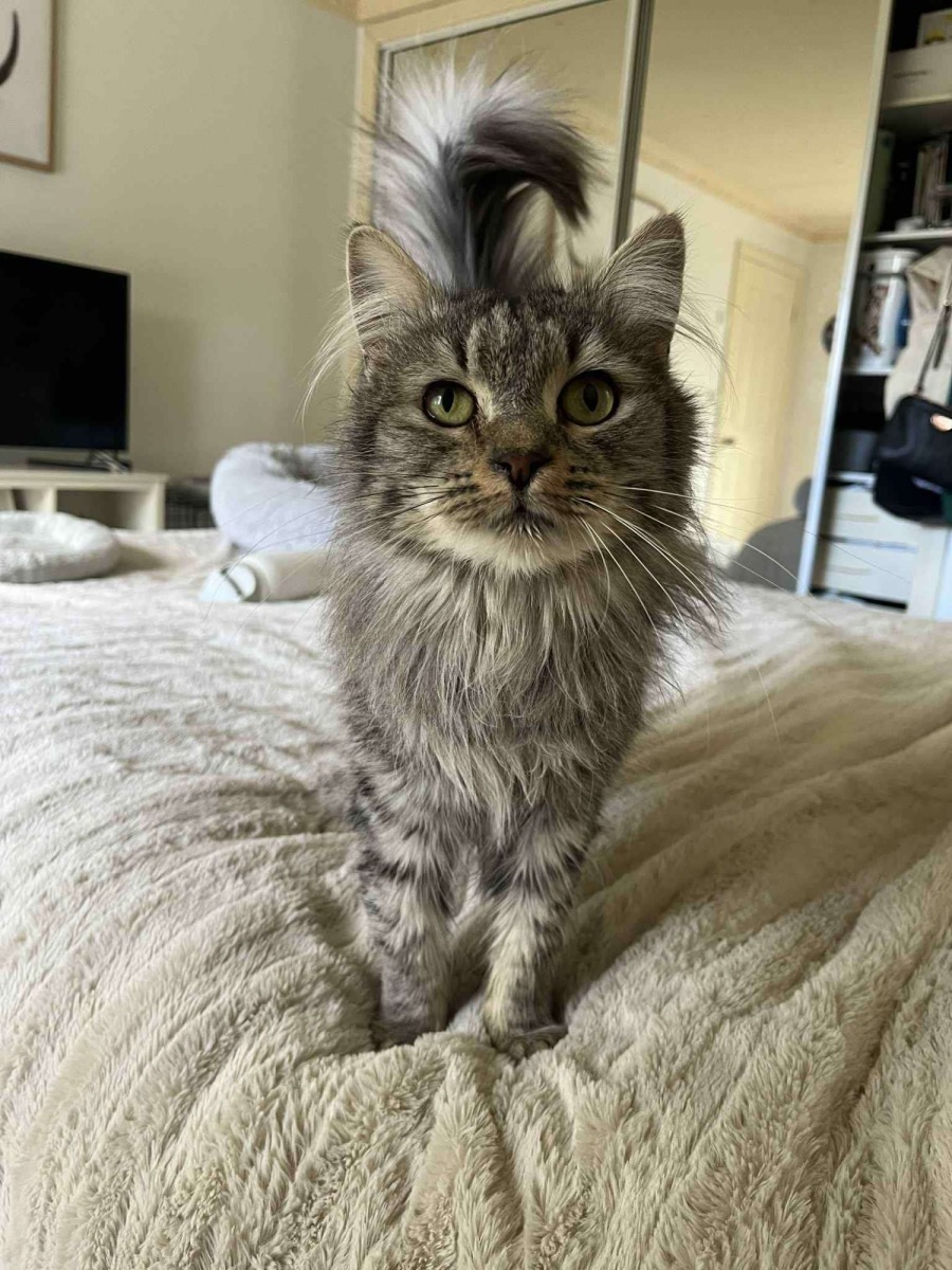When Grace was just a kitten, she battled cat flu, which left her with some scarring in her tear ducts. Because of this, one of her eyes looks a little smaller and tends to water, especially if she’s stressed. She has been fully checked by an eye specialist, who assured us there’s no underlying problem and that it doesn’t cause her any pain or discomfort. It’s purely cosmetic, and in fact, can give her new owner a handy little insight into Grace’s state of mind.