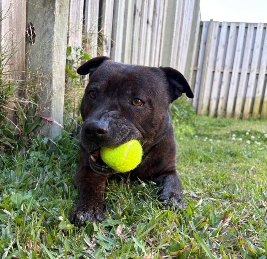 Nugget is a beautiful 7-year-old male English Staffy X. He is a very laid-back dog who loves to receive affection and has so much love to give. Nugget enjoys spending his days with a short walk, followed by rolling around in the morning sun or relaxing in the afternoon shade. In the evenings, he cuddles up in his bed, wrapped in a blanket, and is perfectly content to stay there all night.