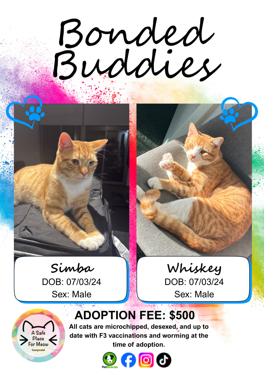 Meet Simba and Whiskey, a delightful pair of bonded brothers who bring the perfect blend of energy and tranquility to any household. These two feline companions are inseparable, and their complementary personalities make them an irresistible duo for cat lovers.
