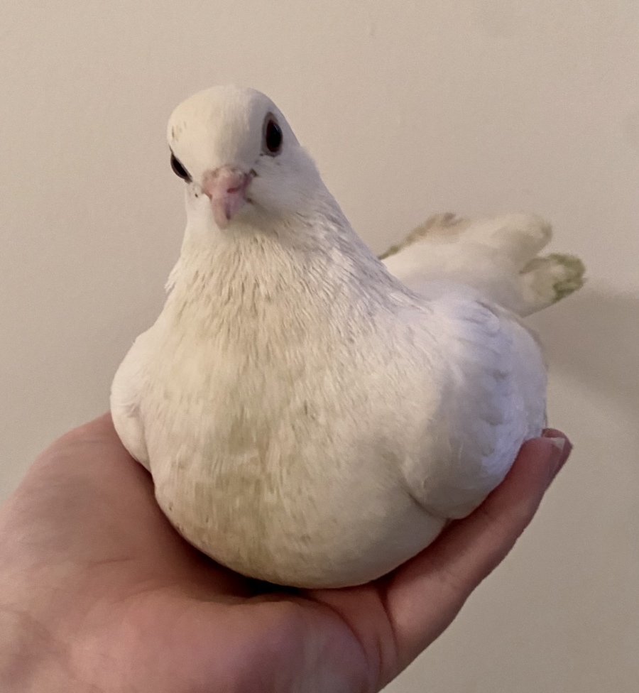 Egg is a gentle little pigeon who is comfortable spending time with people. At the moment, Egg is quite happy sitting on your shoulder and eating from your hand, but she isn’t at the stage yet where she will handle being squished and manhandled, however we think one on one time in an adoptive home might change this.