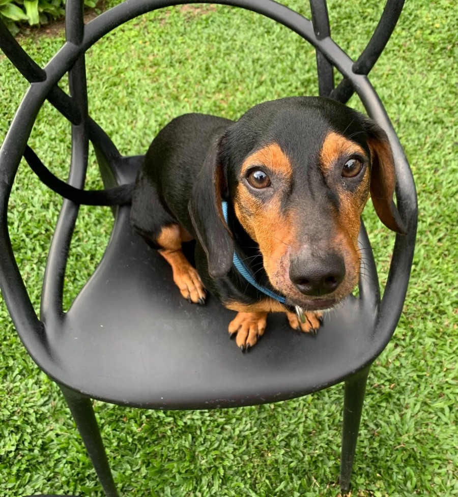 Pumba is a Dachshund/Jack Russell cross. Although he has recognisable physical features and loyalty of a Dachshund, he has the agility and alertness of a JR. Pumba is a small dog but he is not tiny; he weighs approximately 8 kilograms and is fully grown. However, he may put on a bit more weight as he was somewhat underweight when he came into care. Mr P is a striking-looking dog: he has a lovely shiny black coat and tan paws, symmetrical tan circles around his eyes and a white streak down his chest.