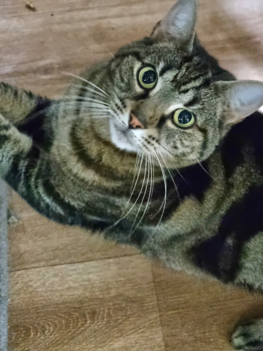 I am a timid, sweet fella who hides in my bed, it makes me feel safe. I come out when you offer me some affection and I enjoy the pats. I am a big smoocher once I get going!