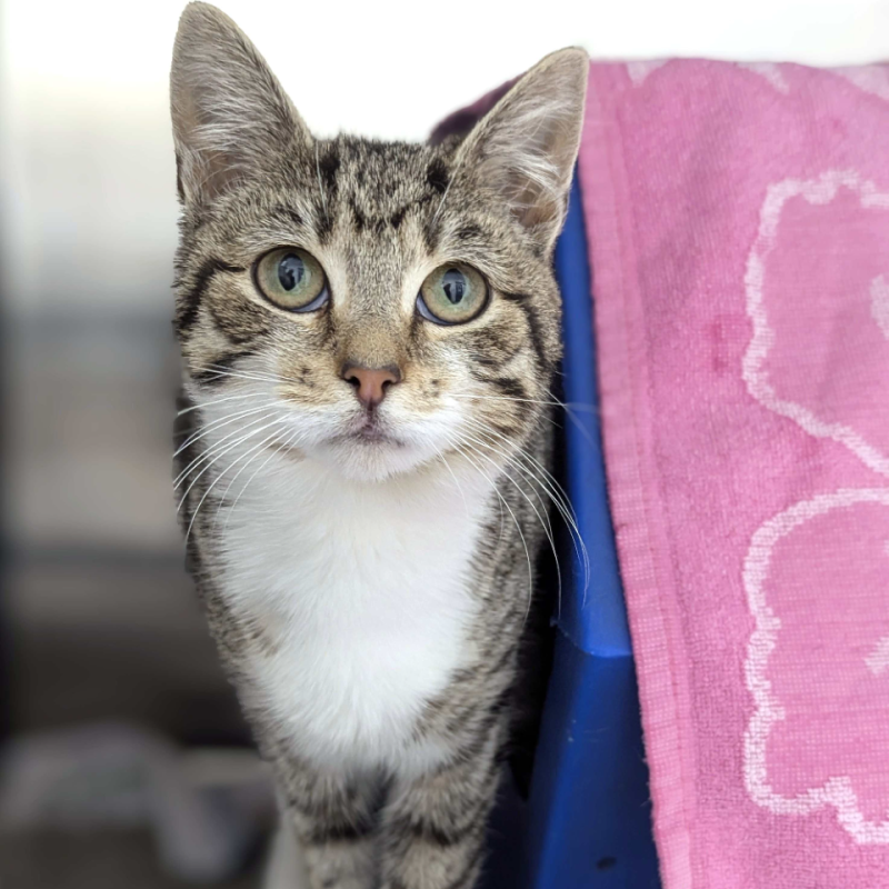 Hi, I'm Tiggy, a female Domestic Short Hair kitten, 4 months old. My energy level is average, so I enjoy a nice blend of playful adventures and peaceful cuddles. I'm curious, affectionate, and I love sunbeams, soft blankets, and exploring new toys. I’m hoping to find a gentle home where I can grow into a confident cat with your guidance. I have no known child-related issues, so I can adapt well to a family that has kids who are kind and patient. I’m learning every day and I respond to soft words, calm pets, and bite-size play sessions. I’d thrive with a routine: a comfy spot for naps, daily play, and a little corner to call my own. I’m friendly with people and I’m eager to be part of your daily life as your companion, purring by your side after a long day. If you’re searching for a sweet, adaptable, and curious little feline to complete your home, I might be the one. I can’t wait to meet you and start our adventures together. Love, Tiggy.