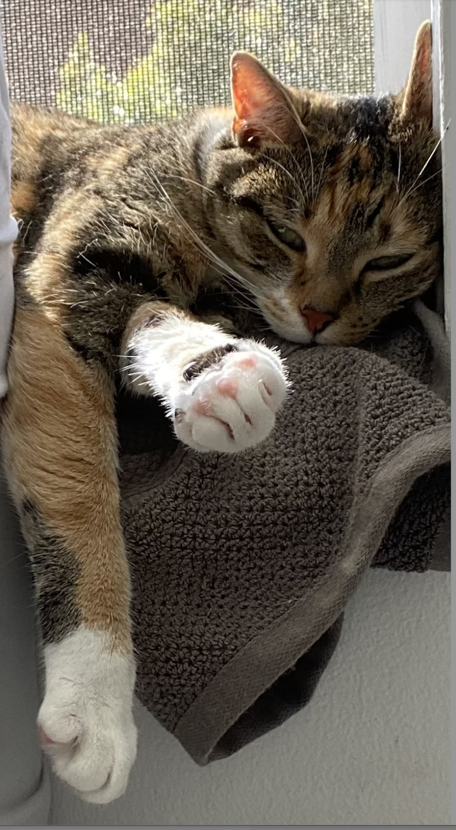 Willow can often be found lounging contentedly in her favourite sun-dappled spot on the windowsill behind your bed, mesmerized by the birds outside.