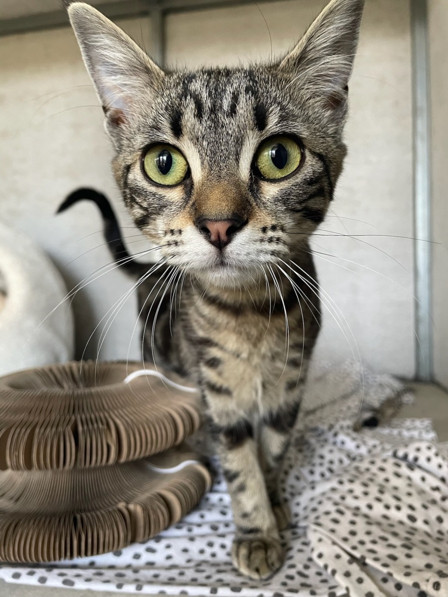 Penny brings a bundle of playfulness into any home. With the energy and curiosity typical of a kitten, Penny is always ready for playtime, and her favourite pastime is a lively game of fetch. This little athlete will often bring her toy back to you, eager for another round. Her love for social interactions extends to her fellow feline and canine friends, as she thrived in foster care with other cats and a dog, enhancing her naturally friendly nature.