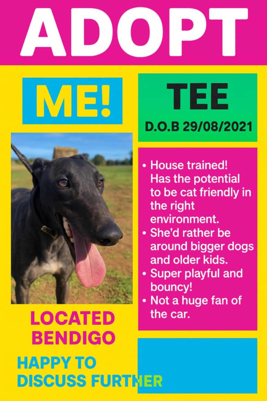Beautiful Tee is fully house trained shoes potential for cat friendly with the right introduction.