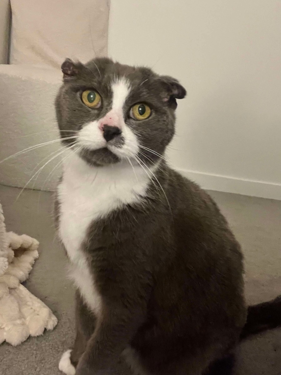 This cutie has folded ears - we aren't sure if he is a Scottish fold mix, or if this is just a quirk / deformity of his. With these ears comes some medical considerations. He has been treated for ear infections and a new owner must understand that he needs regular cleaning, inspection and the possibility of ongoing vet checks and ear drops to support his ear health.