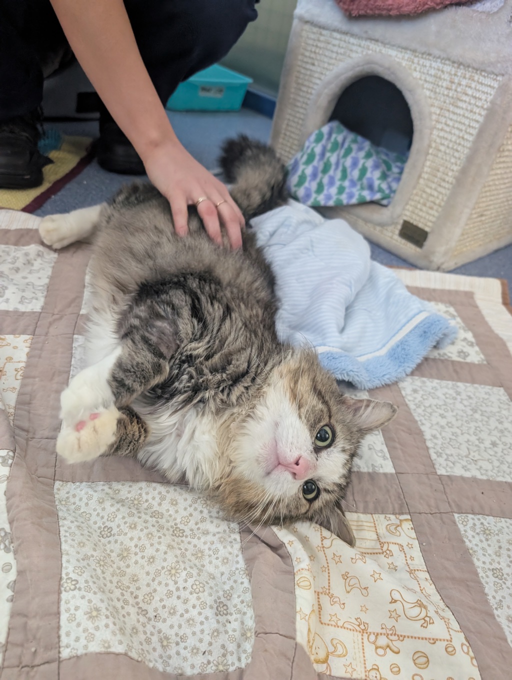 Once a scrappy street cat, now a professional cuddle monster - meet Boysenberry, a 3-year-old fluffball with a big heart and a soft spot for belly rubs.