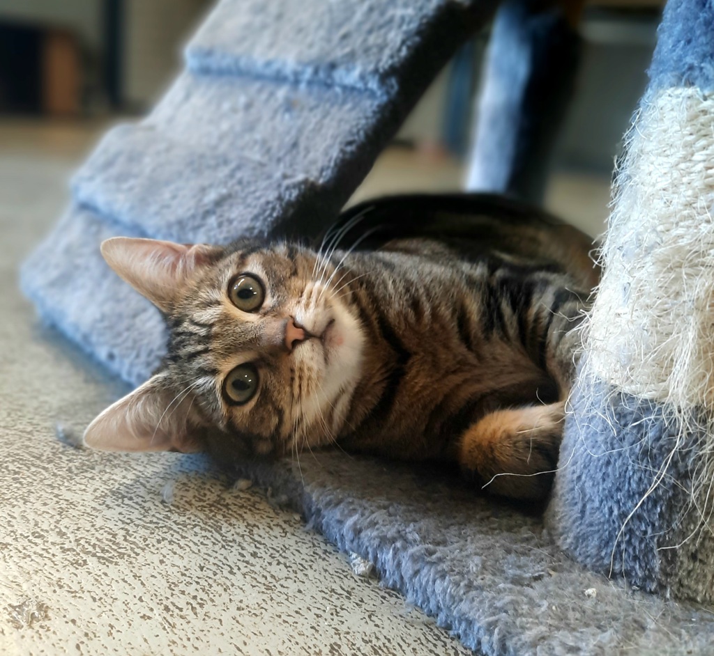 Meet Pretzel, the kitty with the most gorgeous dark tabby pattern. This stunning boy can be a bit shy to begin with, but has lots of love to give and will make a wonderful companion for a calm, older household that is willing to give him the time, patience and love he needs to flourish.