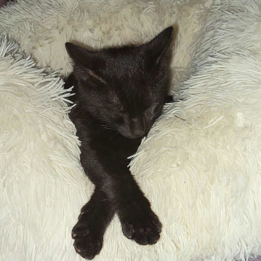 I’ve got a playful side that shines through every day. I love wrestling matches with my siblings, chasing anything that moves, batting around jingle balls, and climbing the cat tower like I own it. When I’m playing, I look just like a mini jungle panther sneaking and pouncing – smooth, sleek, and very cheeky.